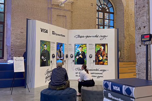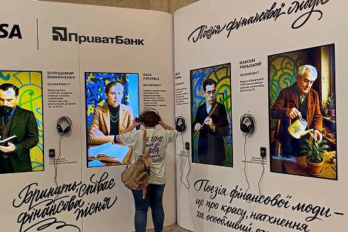 Розроблено інсталяцію «Книга поезії фінансової моди» з використанням AI для синтезу голосів класиків літератури. Інтегровано NFC-технологію: прикладання картки Visa від ПриватБанку активувало персоналізований аудіоконтент біля кожного портрета. Кожен автор отримав окремий сценарій з унікальними поезіями та текстами, відтвореними синтезованим голосом.